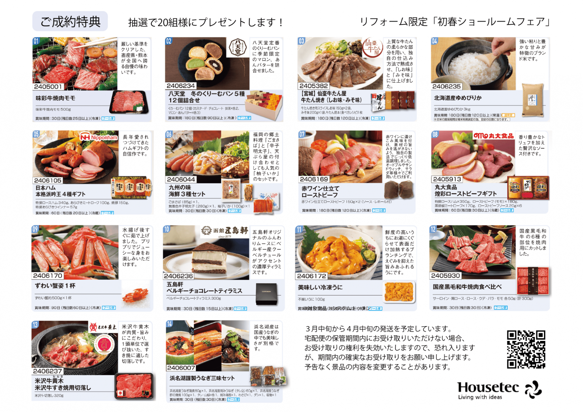 さらに、ご成約いただいた方の中から、抽選で20組様へ「豪華グルメ」が当たるチャンスもご用意しております 。