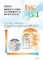 エコジョーズ従来品一次熱交換器タイプ95%給湯熱効率13%CO2排出量熱効率をグンと高め、CO2排出量をグッと抑えるエコな工夫。潜熱回収型ガス給湯機器「エコジョーズ」は、従来は捨てていた排気中の潜熱を回収して再利用することにより、熱効率を約95%にまで高めたガス給湯機器。CO2排出量も従来の給湯器に比べて約13%削減することができます。かしこい仕組みで、熱効率を大幅にアップ。80%給湯熱効率約200°C排熱約排熱ロス、燃焼排気ガス:20%95%給湯熱効率50~80°C排熱50~80潜熱回収型燃焼ガスの熱エネルギーを二次熱交換器が回収して、高い給湯熱効率を実現。給湯熱効率給湯機器からの排熱約15%効率アップ!約約5