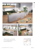 リビングダイニングキッチントイレホールUP玄関L型のキッチンステーションから、緑のインテリアを。優しく柔らかなグリーンが潤いある生活を演出します。KANARIE 57レイアウトプランL型10カタログと実物では色柄が異なります。実物やサンプルなどでご確認ください。