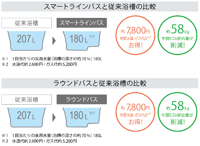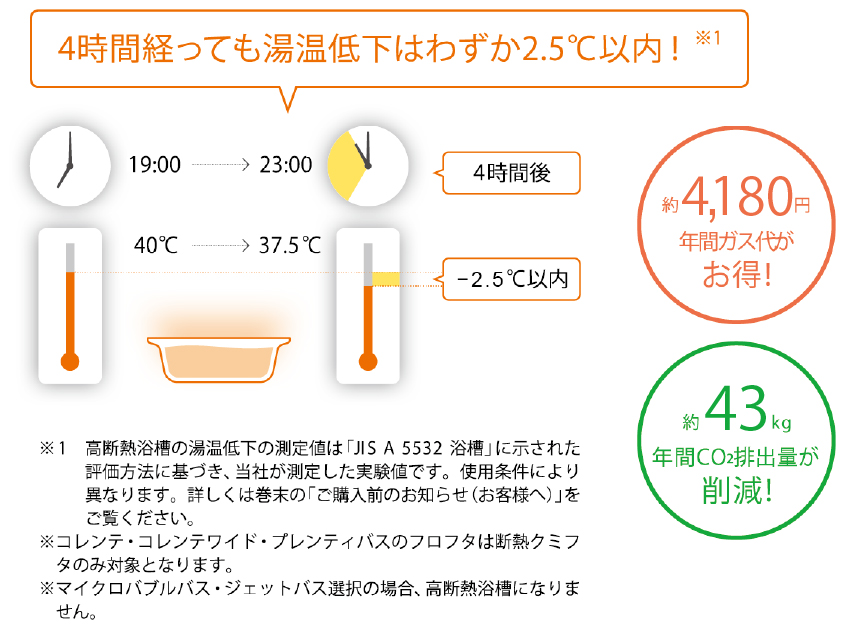 断熱材で浴槽を囲むことで、断熱材のない浴槽と比べて、追いだきも少なくなり、家計と環境に優しい浴槽です。