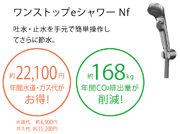湯水に空気を含ませることで、量感たっぷりの浴び心地と大幅な節水を実現。eシャワーNfにすると、約30%節水。ワンストップeシャワーNfにすると従来品シャワーから約44%もの節水を実現します。