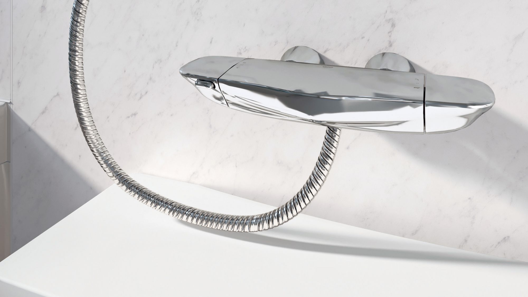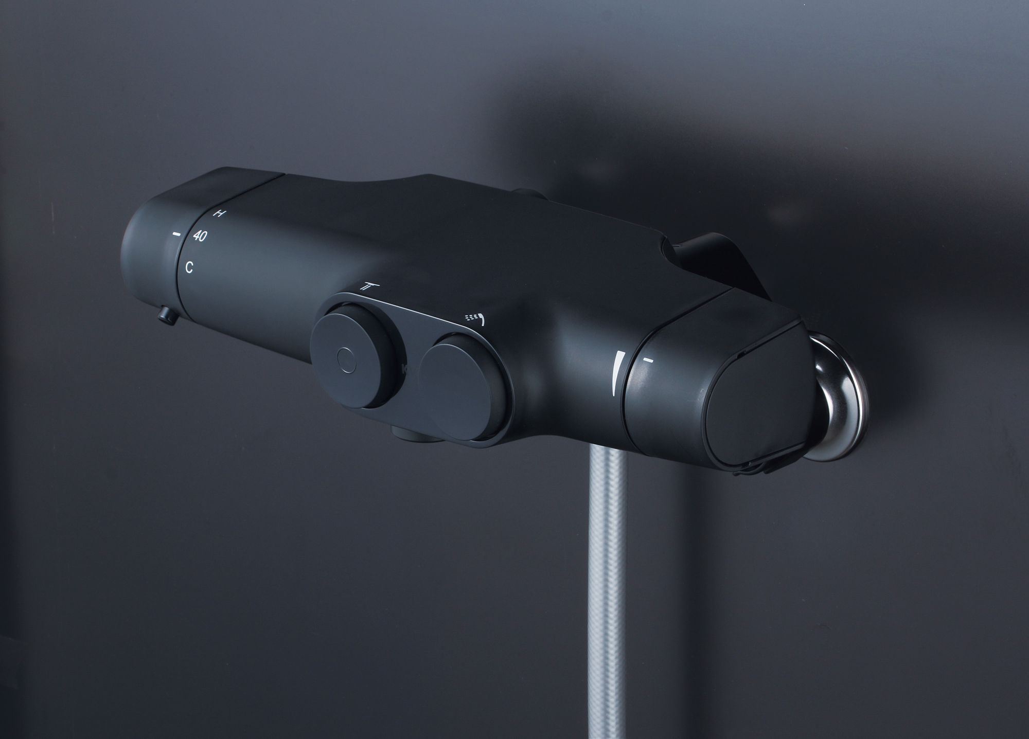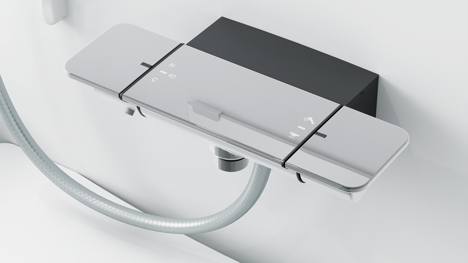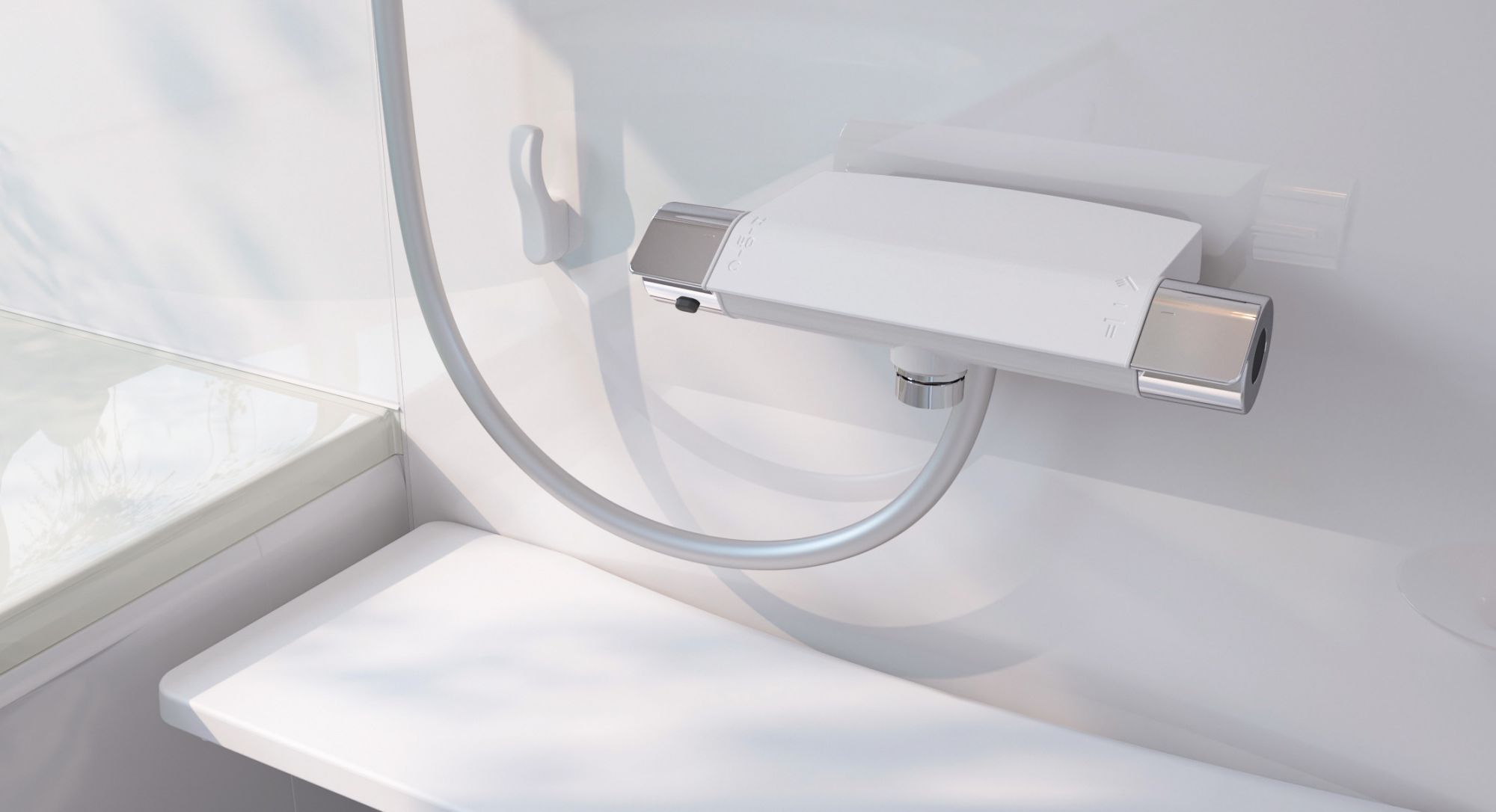 凹凸が少ないシンプルなデザイン。指で押すだけ。簡単操作のワンタッチ式壁付けサーモ水栓です。