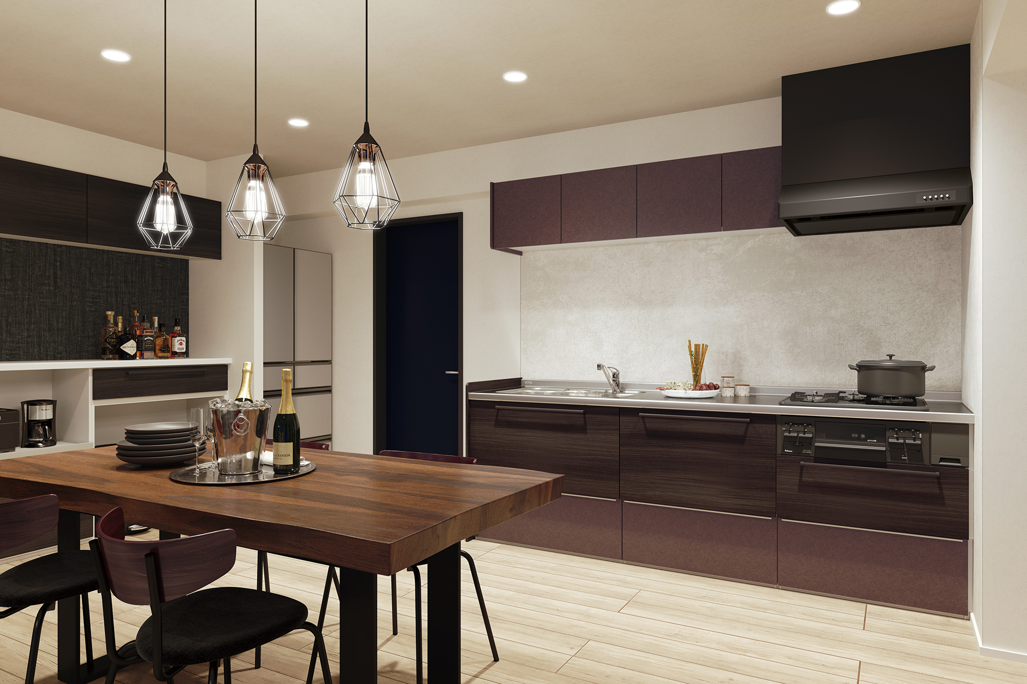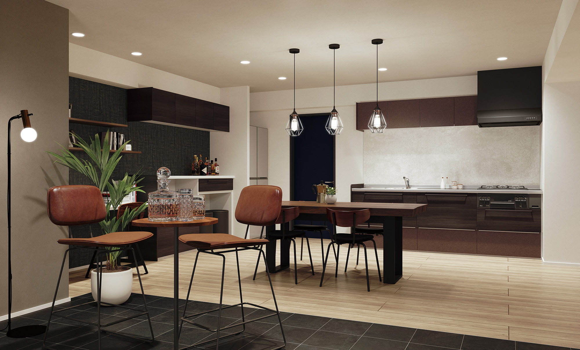 ヴィンテージ感のあるこだわりのあるインテリアに、遊び心あふれたバーコーナーを備えた、広々としたダイニングキッチンとリビング。おもてなしにも相応しい、ゆとりある大人の空間を実現。