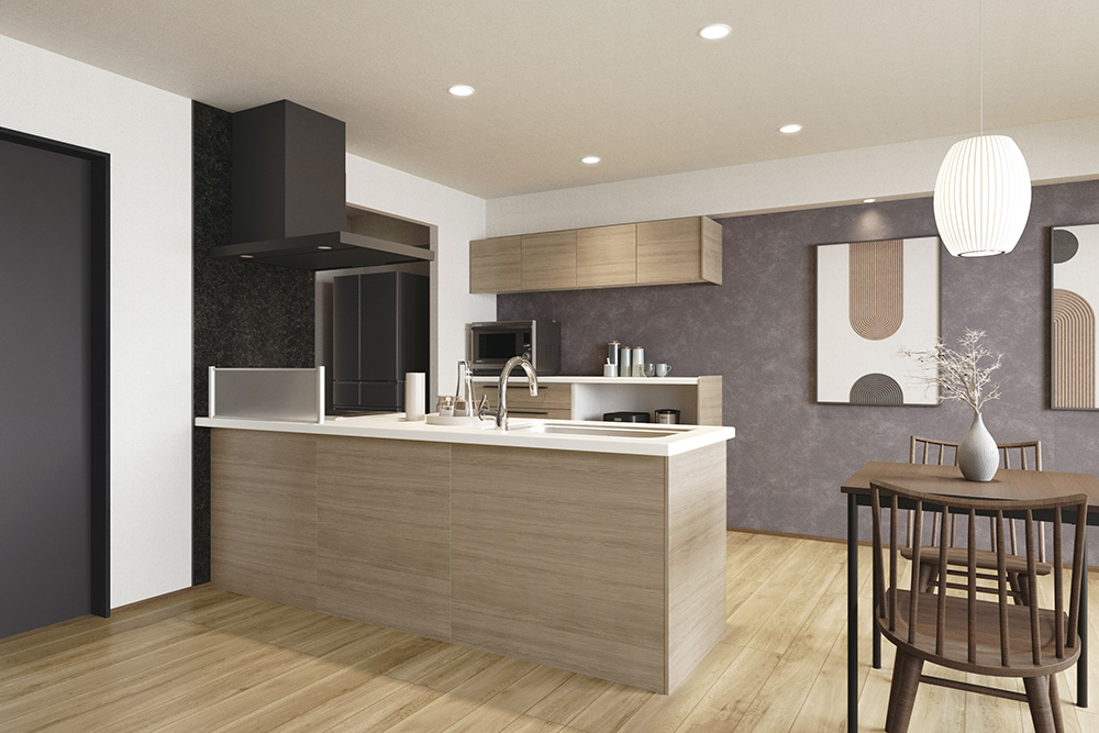 | 扉カラー | キッチン部:上段扉M(ウヅクリグレージュ) 下段扉M(フェルトトープ) 周辺収納部:扉A(ウヅクリグレージュ) |