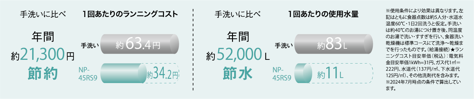 家事が軽減されるだけでなく、水や光熱費の節約にも貢献する食器洗い乾燥機。ぜひ手洗いと比べてみてください。
