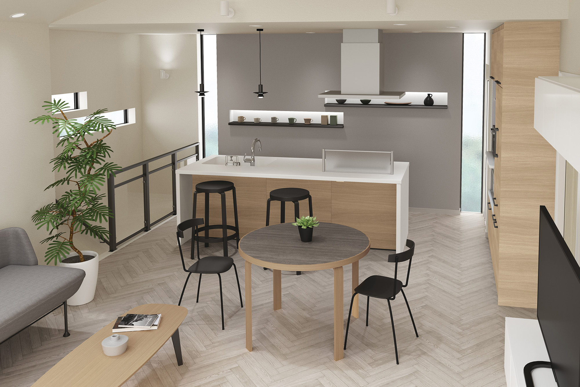 LDKの主役に、幅を抑えたアイランドキッチンを配置して、左右の動線もしっかり確保。
