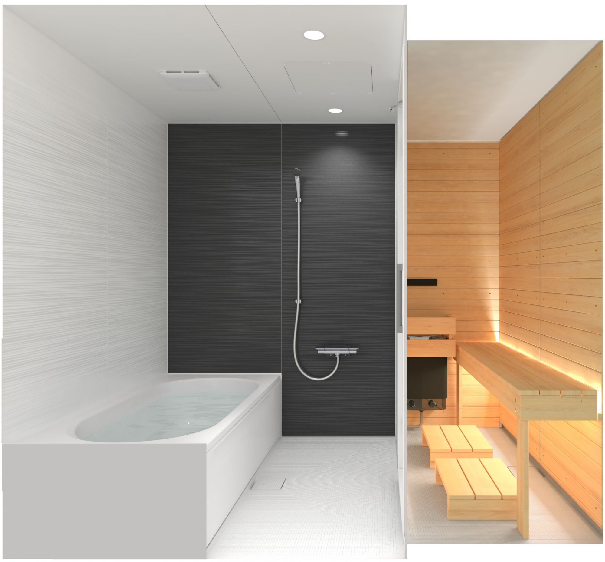 クールダウンにぴったりな折りたたみ式の壁付チェアや人気のオーバーヘッドシャワーもお選びいただけます。