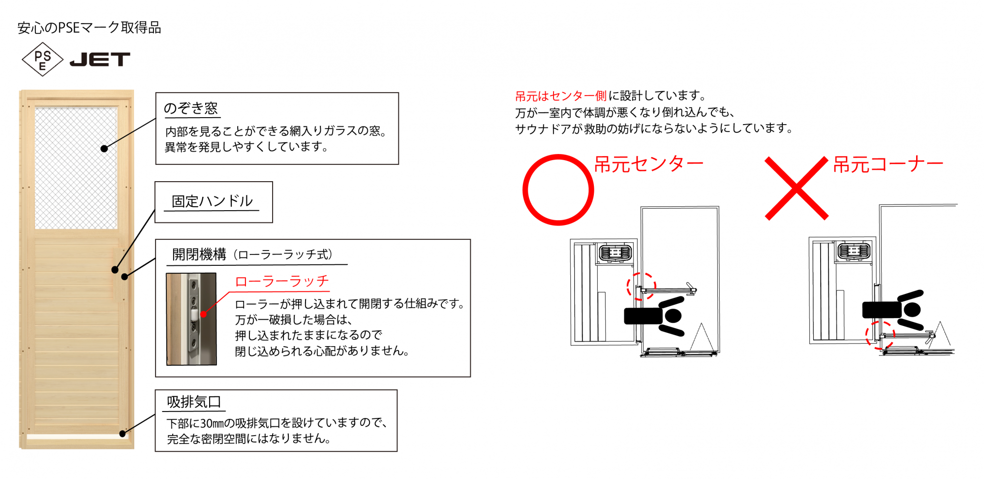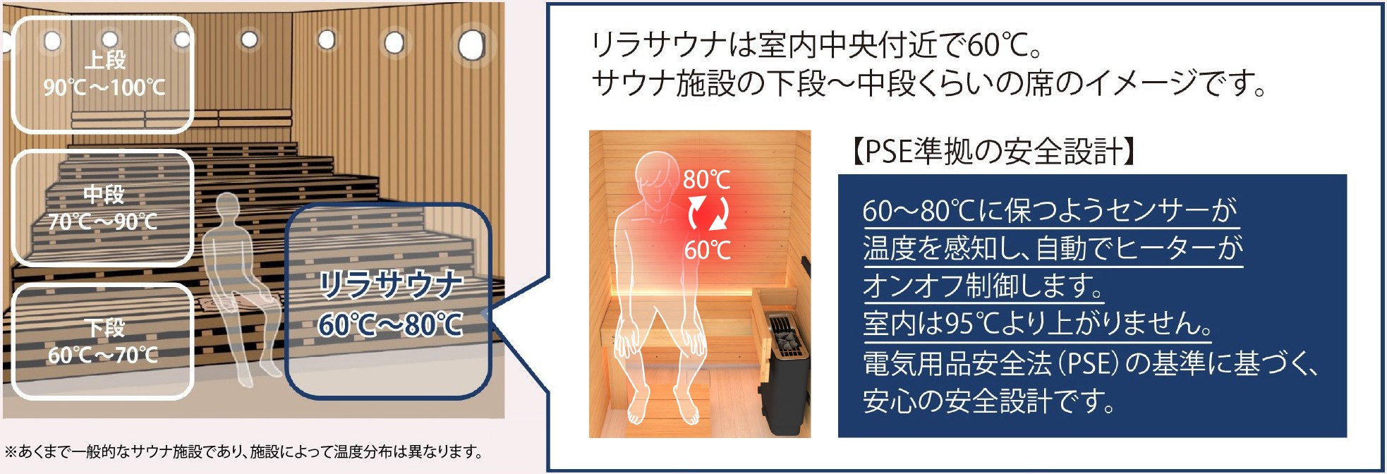 リラサウナはPSEの基準に基づき、 室内中央温度を 60~80℃の範囲に保つ安心の安全設計です。