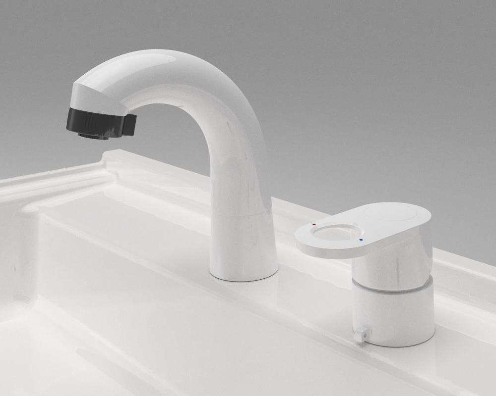スマホやコンタクトの一時置きはもちろん、小さなお子様のうがい・手洗いアイテムを、手の届きやすい位置に置けます。また、リフトアップ水栓のあるウェットエリアは一段低く、約3度の傾斜があり、水はけも良好です。