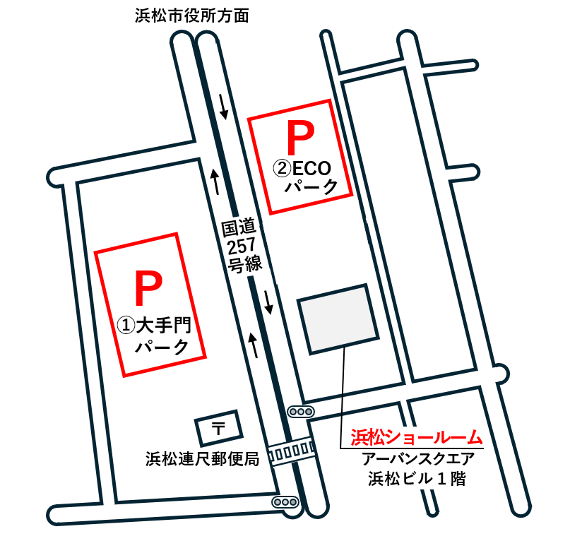 浜松ショールームではお車でお越しのお客様に向けて、以下の提携駐車場をご用意しております。お車でお越しの際は、是非ご利用ください。