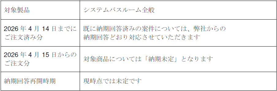 つきましては、誠に心苦しくはございますが、下記対象製品の新規ご注文に関し、当面の間「納期のご回答」を一時停止させていただきます。