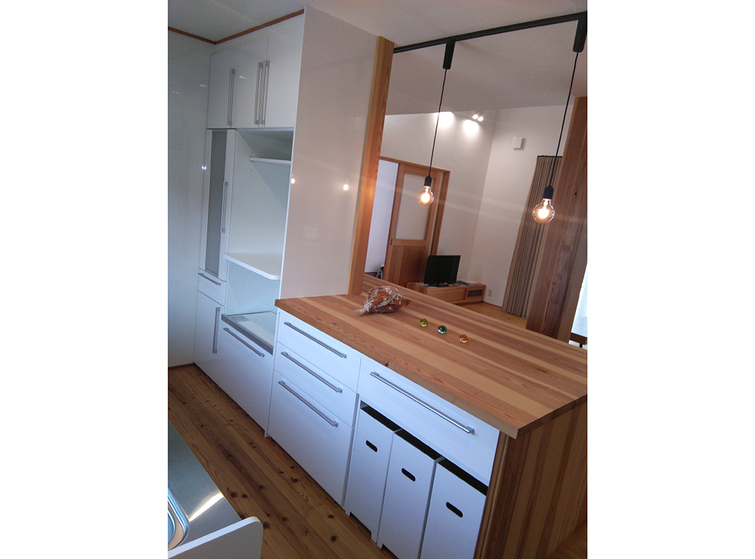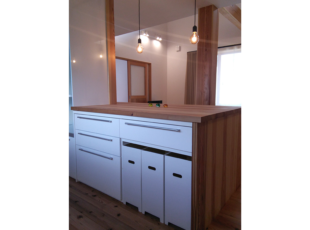 さらに、カップボードの上に木製カウンターを設置することで、造り付けのカウンターテーブルに。