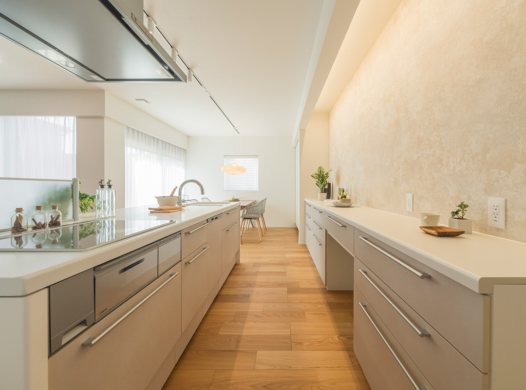 ワークトップと同じ高さのカップボードは、広々としたサブカウンターとして利用でき、家電も使いやすい高さに配置できます。