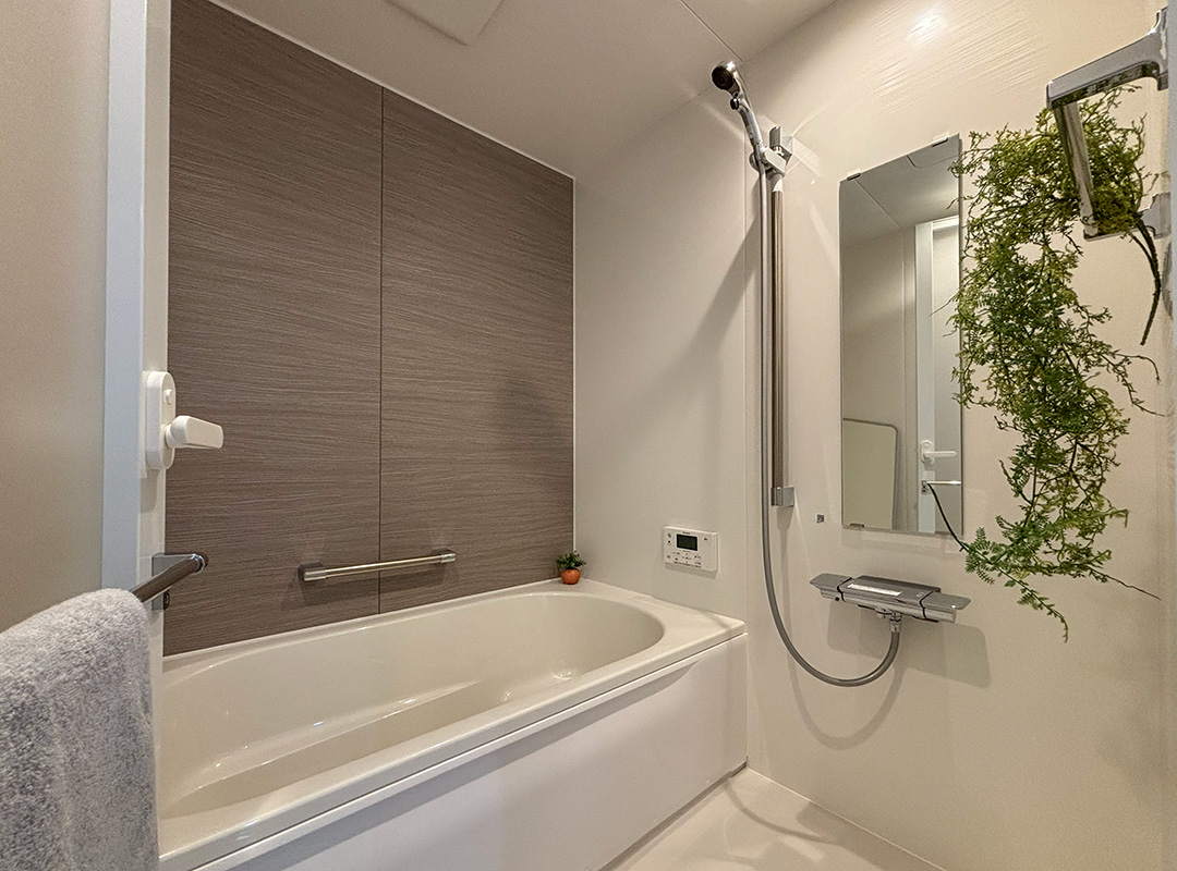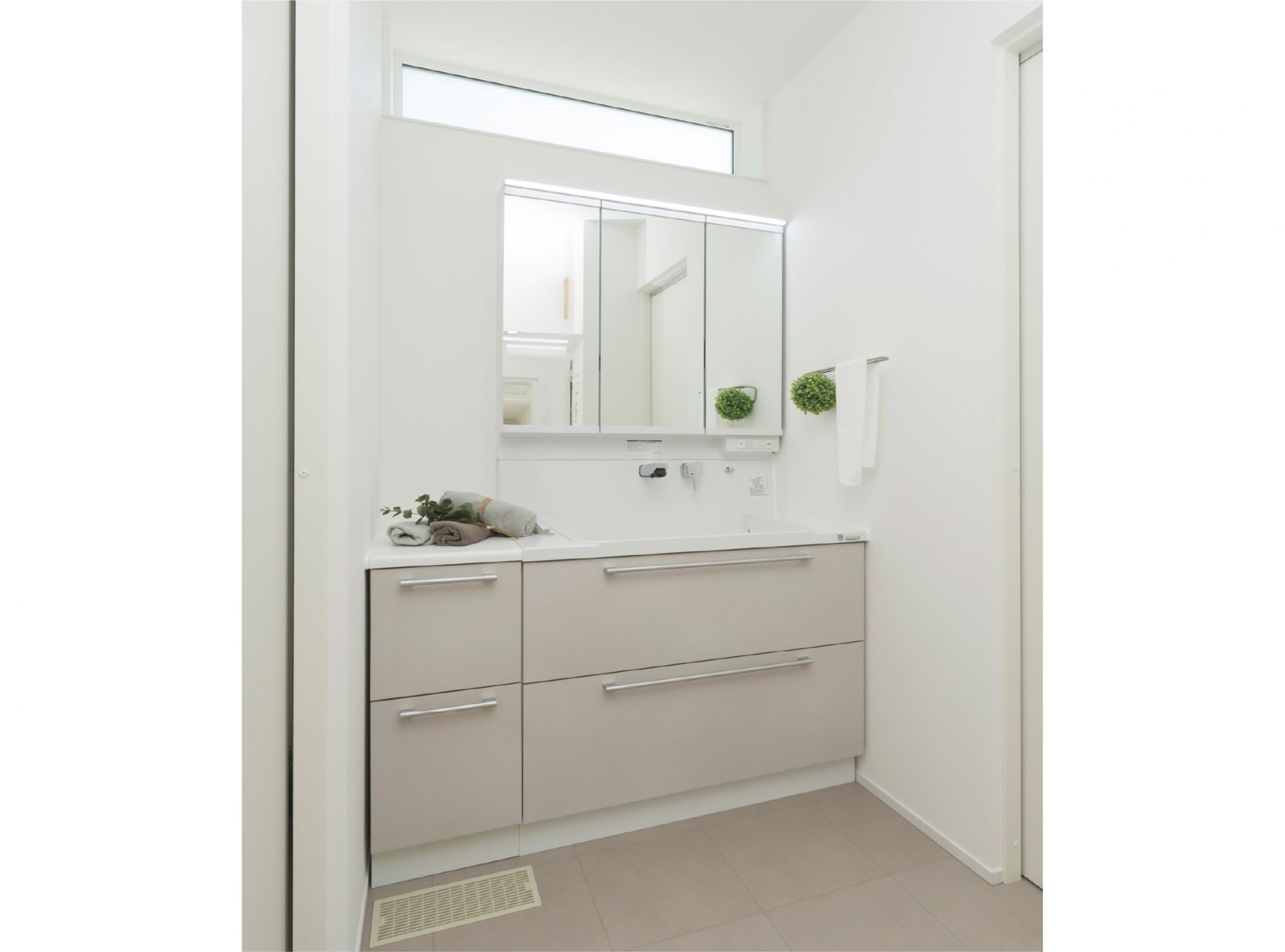 洗面化粧台の扉柄はキッチンと同じ「モードホワイト」、浴室のアクセント壁はグレージュ系の「オークグレージュ」を採用し、統一感を持たせています。
