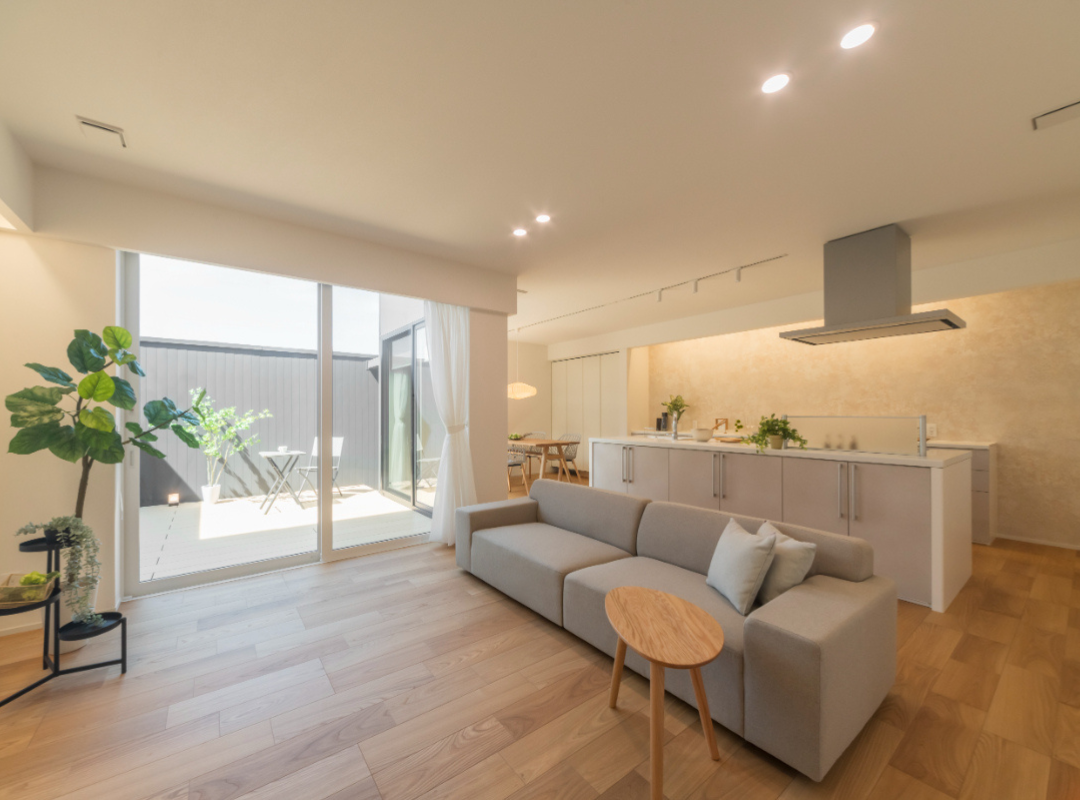 ご夫婦とお子様2人のファミリーを想定し、「シンプルで上質な空間と、家族の成長に寄り添う柔軟性」をコンセプトに設計した建売住宅です。玄関、階段下、LDKには収納をたっぷりと確保。