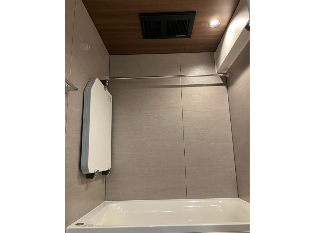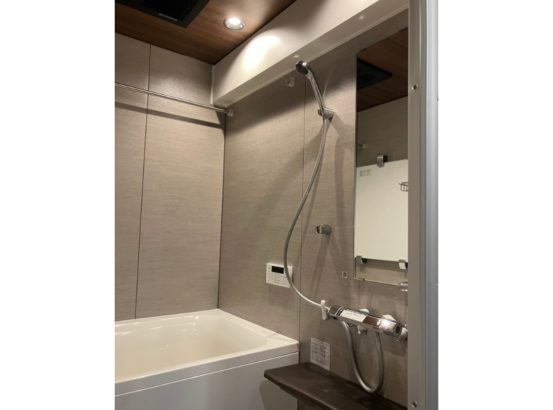 バスルームは、木目の天井と木目の床が気に入り「コンフォーユCK」を採用しました。天井、床、カウンターをダークブラウンで統一し、温かみのある空間を創り出しています。機能面においても、お湯が冷めにくい高断熱浴槽や節水効果のあるシャワーなど、