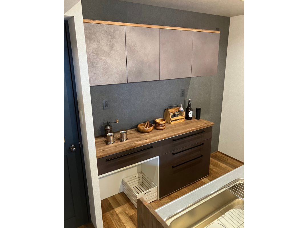 背面収納の吊戸棚上部はあえて空間を開け、「見せる収納」として活用しています。