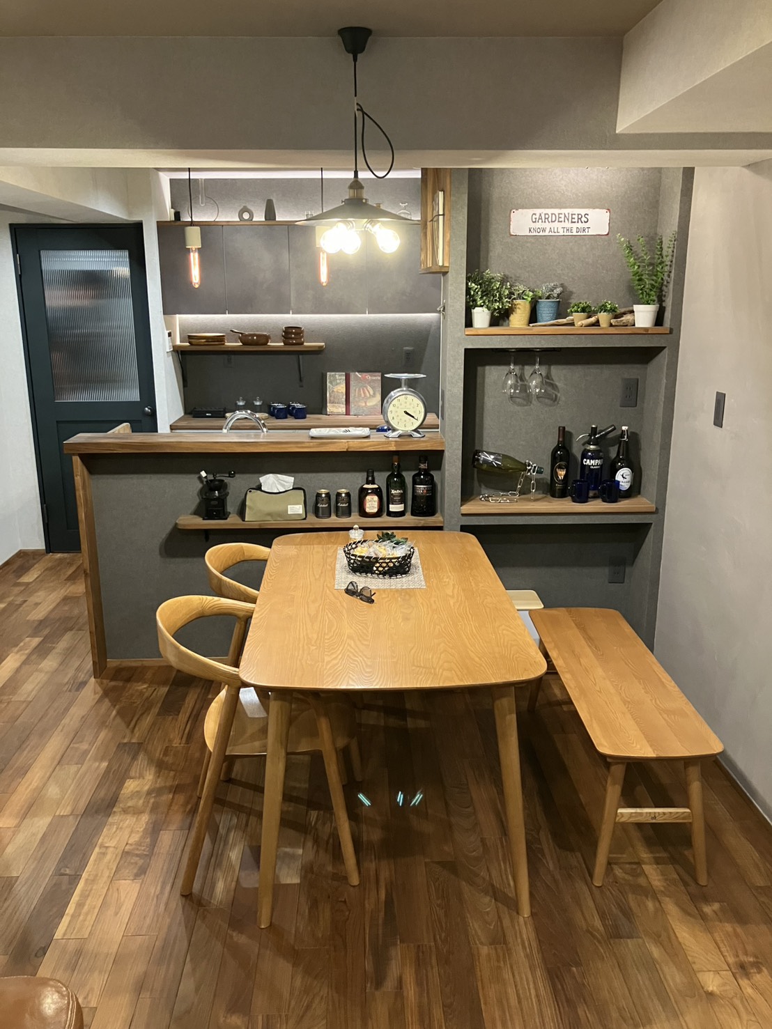 インテリアのテーマであるヴィンテージスタイルに合わせ、チークの無垢ワンピースフローリングに、グレー、ブラック、