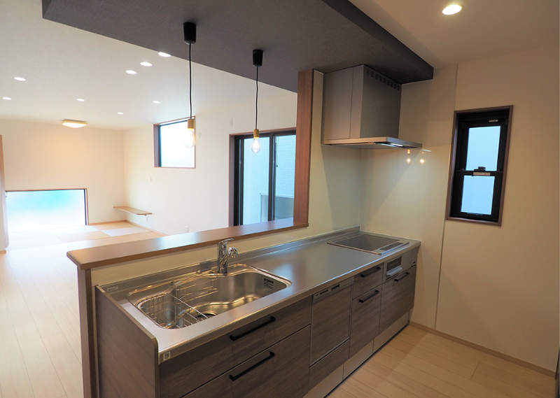 LDKのアクセントとして、キッチンファニチャーの背面壁には、インスタグラムで人気の白いレンガ調の壁紙を、キッチン上部にブラックの下がり天井を設置、さらに落ち着いた雰囲気を演出するペンダント照明を選んで、おしゃれな空間をつくりました。