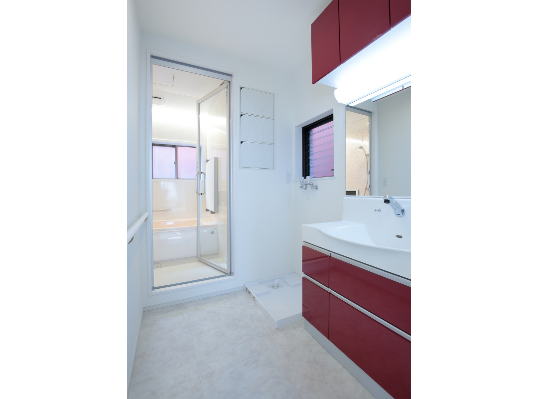 洗面化粧台(ラヴァーボプラス)は、扉柄の赤色(パオロッサレッド)が目を引き、印象的な洗面脱衣室となりました。