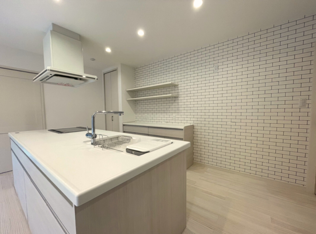 キッチン背面にはファニチャーとディスプレイができる棚を設置。